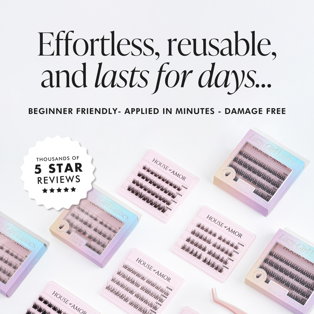 Our Lazy Girl Lash collection is the ultimate press-on lash system. No glue, no mess—just press and go! Each cluster comes pre-glued for effortless application. Enjoy a seamless look that lasts 3-5 days or more. Lashes have never been easier!